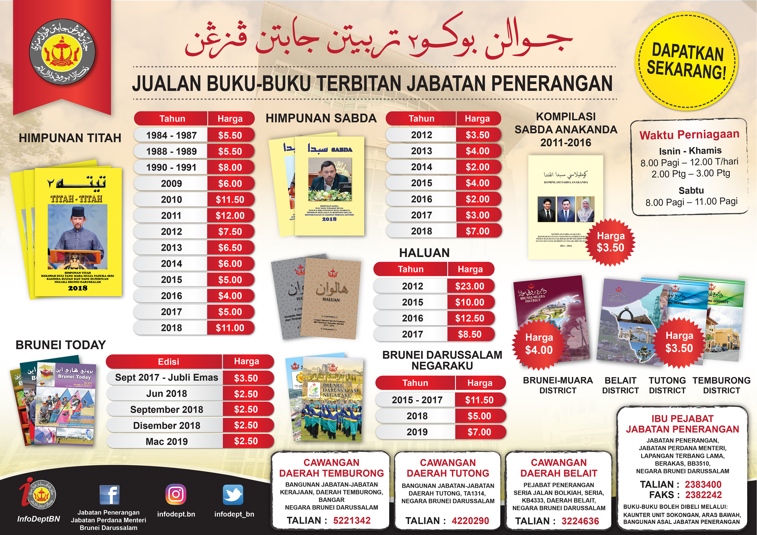 The Department of Information, the Prime Minister's Office has started selling the following publications: Himpunan Titah, Himpunan Sabda, Kompilasi Sabda Anakanda, Haluan, Brunei Darussalam Negaraku as well as district books (Tutong District and Temburong District). The public can get the books from Headquarters, Department of Information, as well as Information branches in each district.For information, the business hours are follows: Monday to Thursday 8.00 am – 12. 00 noon 2.00 pm – 3.00 pm Saturday 8.00 am – 11. 00 pm